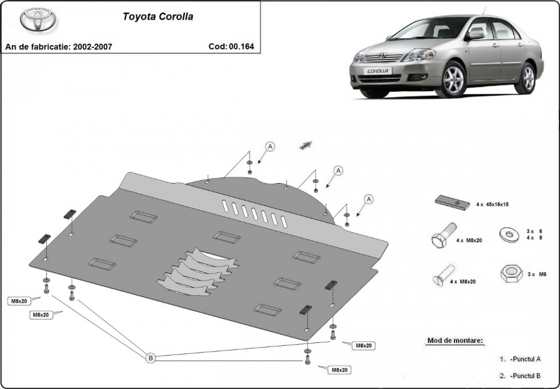 La piastra paramotore di Acciaio è nuova e si adatta perfettamente a tutte le versioni di Toyota Corolla prodotte tra il 2002 e il 2007. É fatto di lamiera d'Acciaio di 2mm. Bulloni, dadi, rondelle e tutti gli accessori allegati Ogni piastra è resistente alla corrosione ed è ricoperto di vernice in polvere. Le piastre di protezione del motore sono attrezzati di coppie saldate per la miglior resistenza alle forze exteriori. |