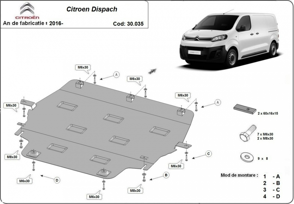 La piastra paramotore di Acciaio è nuova e si adatta perfettamente alla Citroen Dispatch, con le seguenti versioni motore / trazione: toTE - prodotte tra il 2016 e il 2026. É fatto di lamiera d'Acciaio di 2mm. Bulloni, dadi, rondelle e tutti gli accessori allegati Ogni piastra è resistente alla corrosione ed è ricoperto di vernice in polvere. Le piastre di protezione del motore sono attrezzati di coppie saldate per la miglior resistenza alle forze exteriori. |