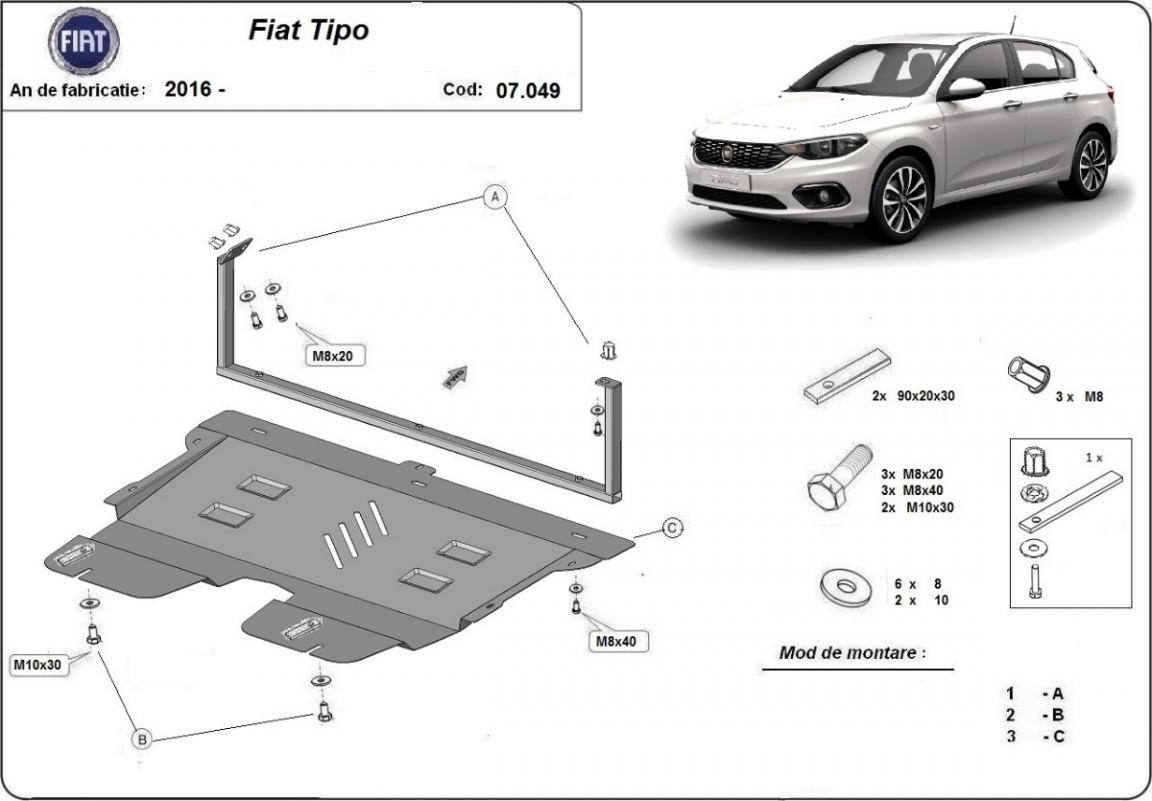 La piastra paramotore di Acciaio è nuova e si adatta perfettamente a tutte le versioni di Fiat Tipo prodotte tra il 2015 e il 2026. É fatto di lamiera d'Acciaio di 2mm. Bulloni, dadi, rondelle e tutti gli accessori allegati Ogni piastra è resistente alla corrosione ed è ricoperto di vernice in polvere. Le piastre di protezione del motore sono attrezzati di coppie saldate per la miglior resistenza alle forze exteriori. |