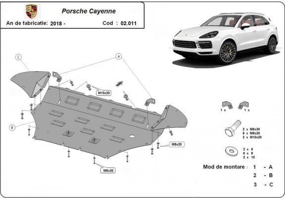 La piastra paramotore di Acciaio è nuova e si adatta perfettamente a tutte le versioni di Porsche Cayenne prodotte tra il 2018 e il 2026. É fatto di lamiera d'Acciaio di 2mm. Bulloni, dadi, rondelle e tutti gli accessori allegati Ogni piastra è resistente alla corrosione ed è ricoperto di vernice in polvere. Le piastre di protezione del motore sono attrezzati di coppie saldate per la miglior resistenza alle forze exteriori. |
