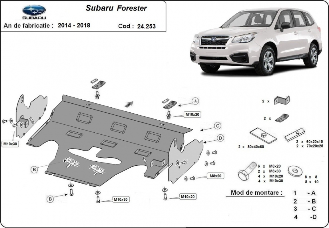La piastra paramotore di Acciaio è nuova e si adatta perfettamente a tutte le versioni di Subaru Forester 4 prodotte tra il 2014 e il 2018. É fatto di lamiera d'Acciaio di 2mm. Bulloni, dadi, rondelle e tutti gli accessori allegati Ogni piastra è resistente alla corrosione ed è ricoperto di vernice in polvere. Le piastre di protezione del motore sono attrezzati di coppie saldate per la miglior resistenza alle forze exteriori. |