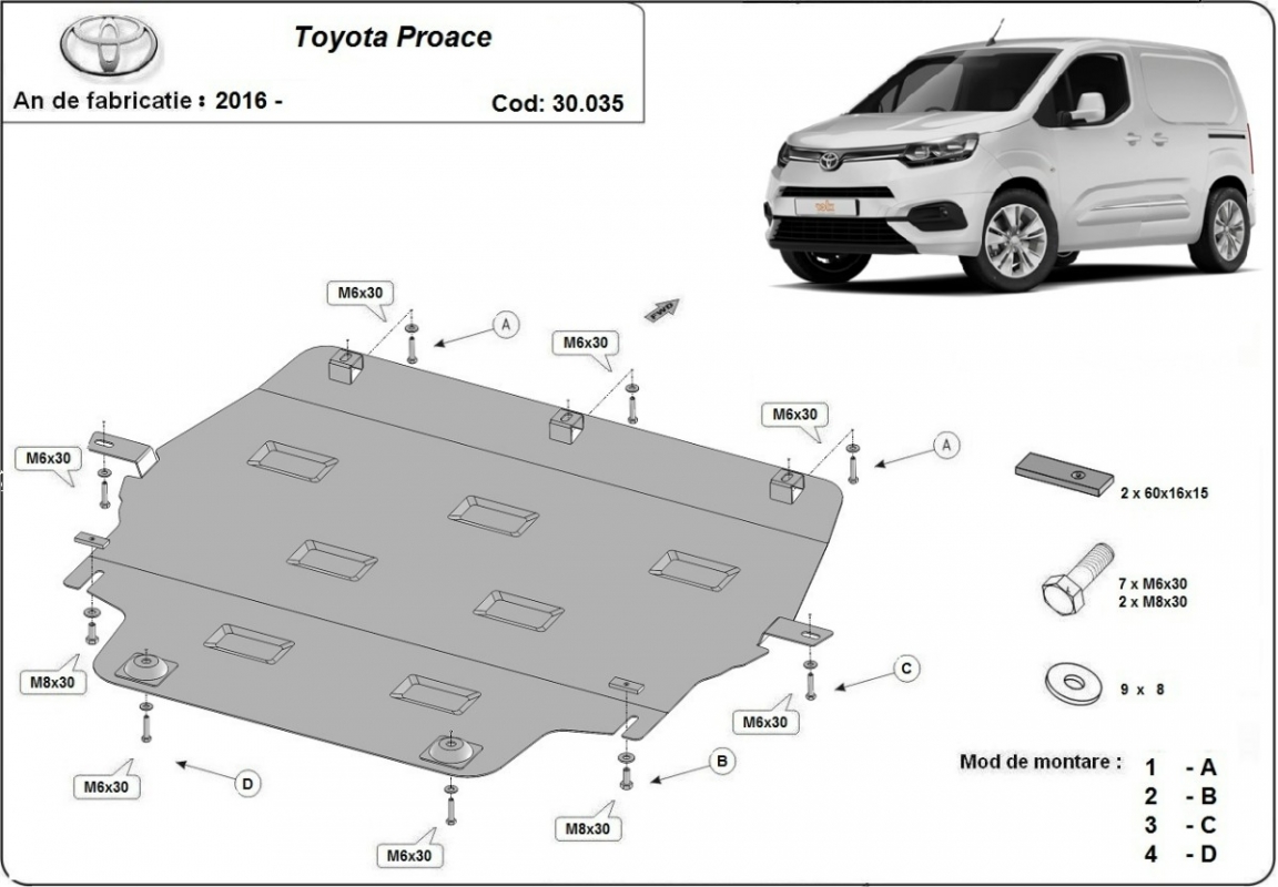 La piastra paramotore di Acciaio è nuova e si adatta perfettamente a tutte le versioni di Toyota Proace prodotte tra il 2016 e il 2026. É fatto di lamiera d'Acciaio di 2mm. Bulloni, dadi, rondelle e tutti gli accessori allegati Ogni piastra è resistente alla corrosione ed è ricoperto di vernice in polvere. Le piastre di protezione del motore sono attrezzati di coppie saldate per la miglior resistenza alle forze exteriori. |