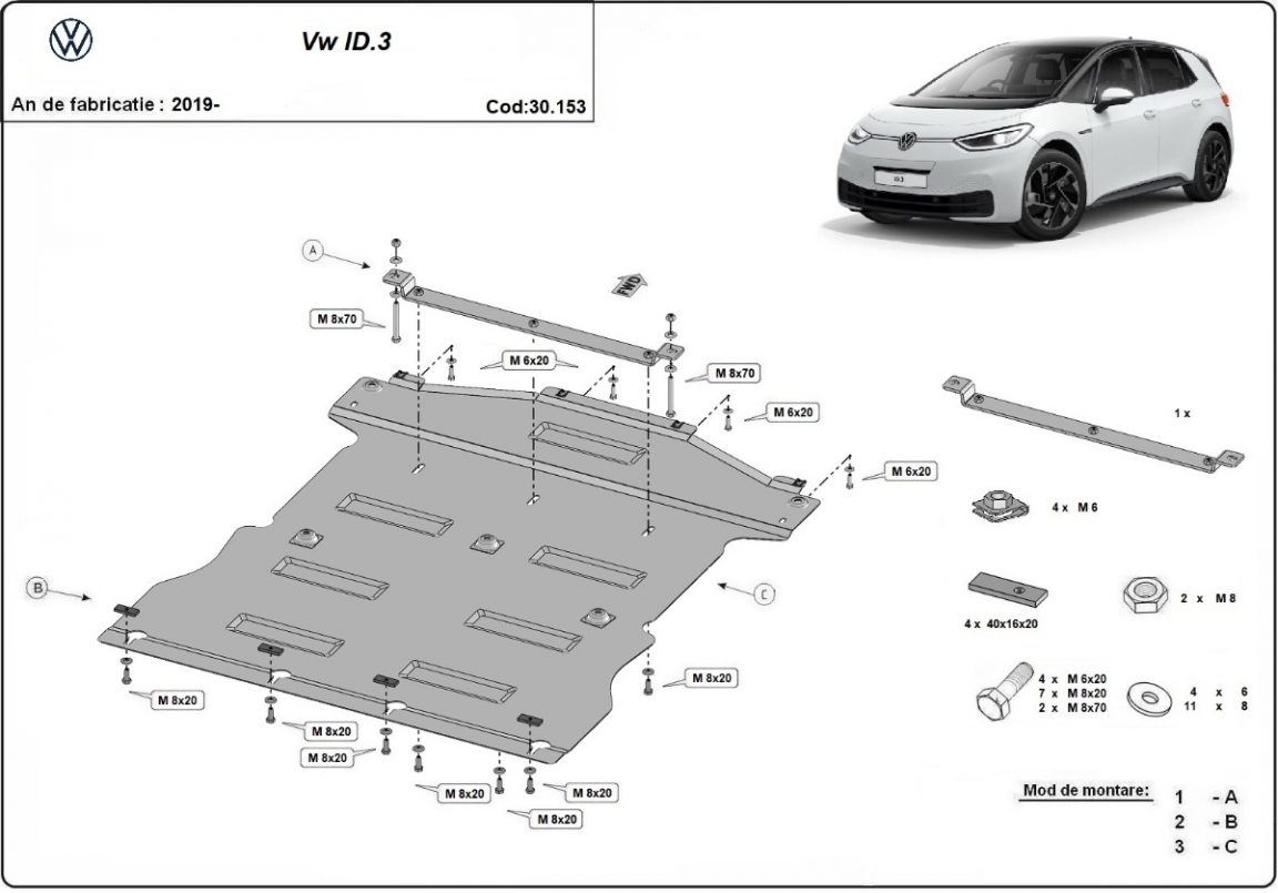 La piastra paramotore di Acciaio è nuova e si adatta perfettamente a tutte le versioni di Volkswagen ID 3 prodotte tra il 2019 e il 2026. É fatto di lamiera d'Acciaio di 2mm. Bulloni, dadi, rondelle e tutti gli accessori allegati Ogni piastra è resistente alla corrosione ed è ricoperto di vernice in polvere. Le piastre di protezione del motore sono attrezzati di coppie saldate per la miglior resistenza alle forze exteriori. |