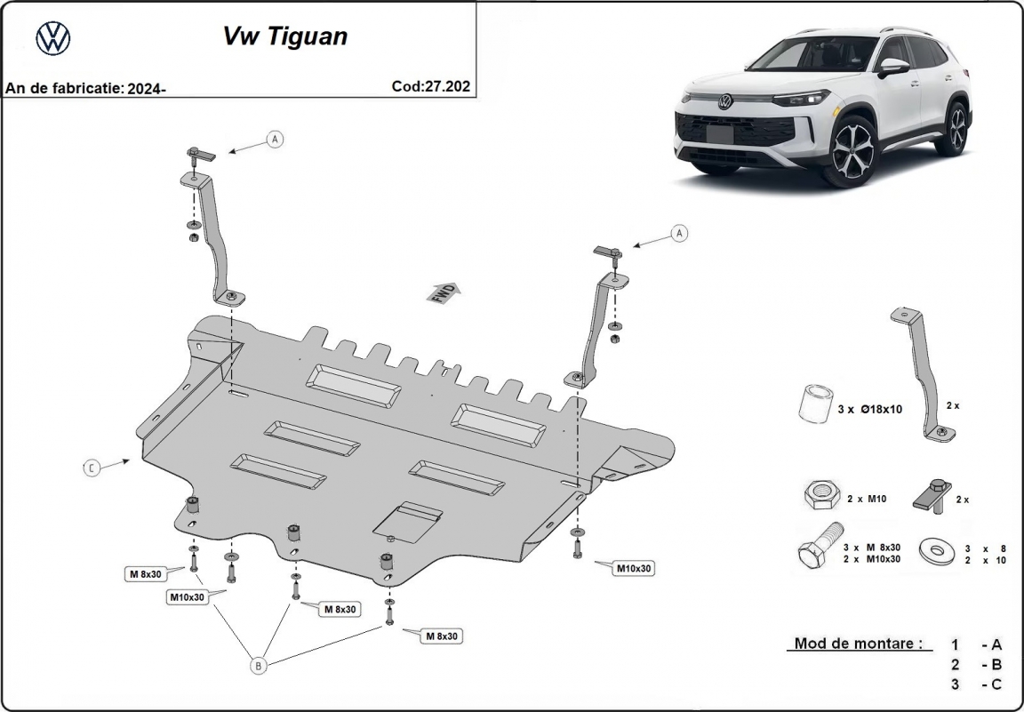 La piastra paramotore di Acciaio è nuova e si adatta perfettamente alla VW Tiguan, con le seguenti versioni motore / trazione: non-hybrid - prodotte tra il 2024 e il 2026. É fatto di lamiera d'Acciaio di 2mm. Bulloni, dadi, rondelle e tutti gli accessori allegati Ogni piastra è resistente alla corrosione ed è ricoperto di vernice in polvere. Le piastre di protezione del motore sono attrezzati di coppie saldate per la miglior resistenza alle forze exteriori. |