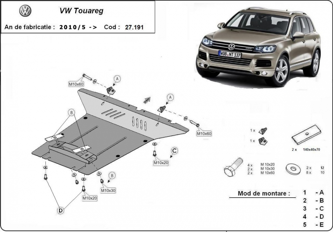 La piastra paramotore di Acciaio è nuova e si adatta perfettamente a tutte le versioni di VW Touareg prodotte tra il 2010 e il 2018. É fatto di lamiera d'Acciaio di 2,5mm. Bulloni, dadi, rondelle e tutti gli accessori allegati Ogni piastra è resistente alla corrosione ed è ricoperto di vernice in polvere. Le piastre di protezione del motore sono attrezzati di coppie saldate per la miglior resistenza alle forze exteriori. |