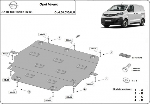 La piastra paramotore di Alluminio è nuova e si adatta perfettamente a tutte le versioni di Opel Vivaro prodotte tra il 2019 e il 2026. É fatto di lamiera d'Alluminio di 3mm. Gli scudi sono in alluminio, ma i supporti di fissaggio sono in acciaio. Bulloni, dadi, rondelle e tutti gli accessori allegati Ogni piastra è resistente alla corrosione ed è ricoperto di vernice in polvere. Le piastre di protezione del motore sono attrezzati di coppie saldate per la miglior resistenza alle forze exteriori. |