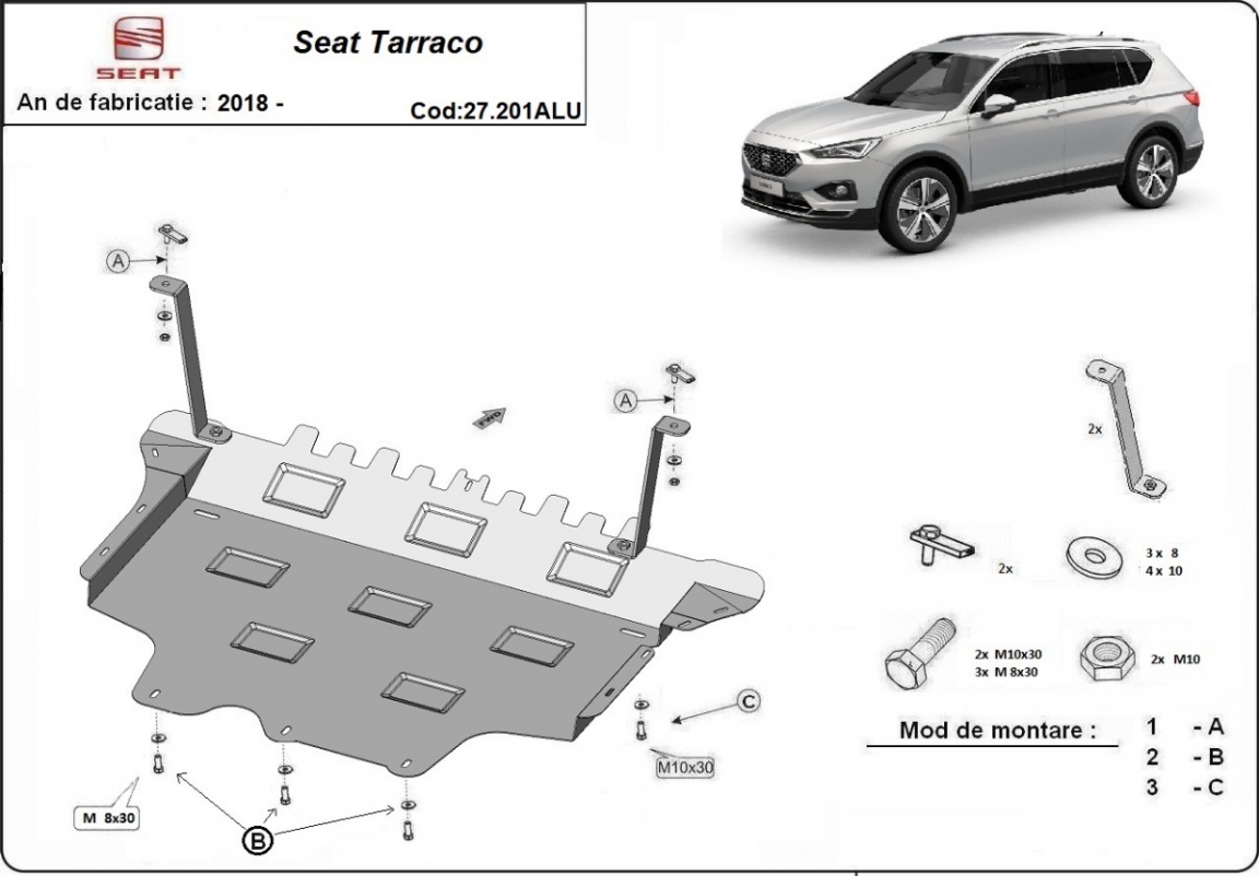 La piastra paramotore di Alluminio è nuova e si adatta perfettamente a tutte le versioni di Seat Tarraco prodotte tra il 2018 e il 2026. É fatto di lamiera d'Alluminio di 3mm. Gli scudi sono in alluminio, ma i supporti di fissaggio sono in acciaio. Bulloni, dadi, rondelle e tutti gli accessori allegati Ogni piastra è resistente alla corrosione ed è ricoperto di vernice in polvere. Le piastre di protezione del motore sono attrezzati di coppie saldate per la miglior resistenza alle forze exteriori. |
