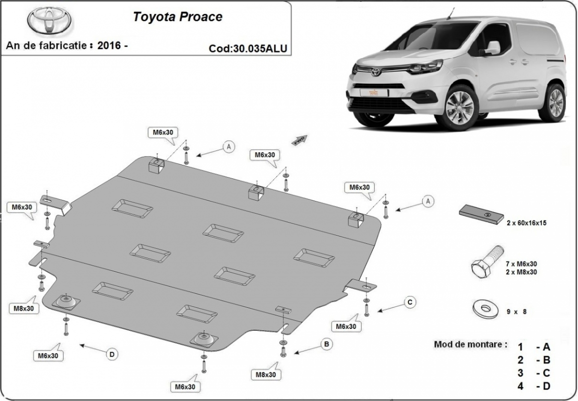 La piastra paramotore di Alluminio è nuova e si adatta perfettamente a tutte le versioni di Toyota Proace prodotte tra il 2016 e il 2026. É fatto di lamiera d'Alluminio di 3mm. Gli scudi sono in alluminio, ma i supporti di fissaggio sono in acciaio. Bulloni, dadi, rondelle e tutti gli accessori allegati Ogni piastra è resistente alla corrosione ed è ricoperto di vernice in polvere. Le piastre di protezione del motore sono attrezzati di coppie saldate per la miglior resistenza alle forze exteriori. |