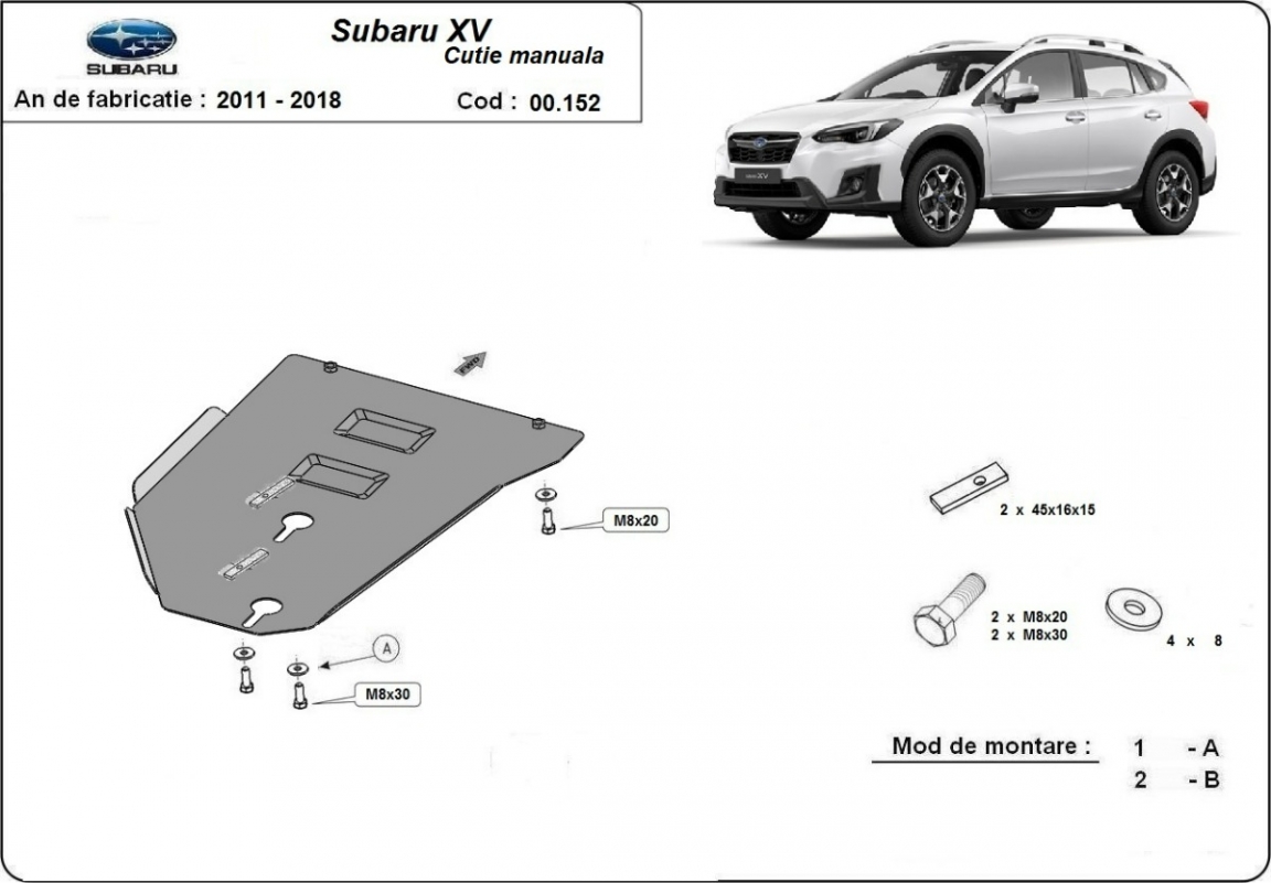 La piastra paramotore di Acciaio è nuova e si adatta perfettamente a tutte le versioni di Subaru XV prodotte tra il 2011 e il 2017. É fatto di lamiera d'Acciaio di 2mm. Bulloni, dadi, rondelle e tutti gli accessori allegati Ogni piastra è resistente alla corrosione ed è ricoperto di vernice in polvere. Le piastre di protezione del motore sono attrezzati di coppie saldate per la miglior resistenza alle forze exteriori. |