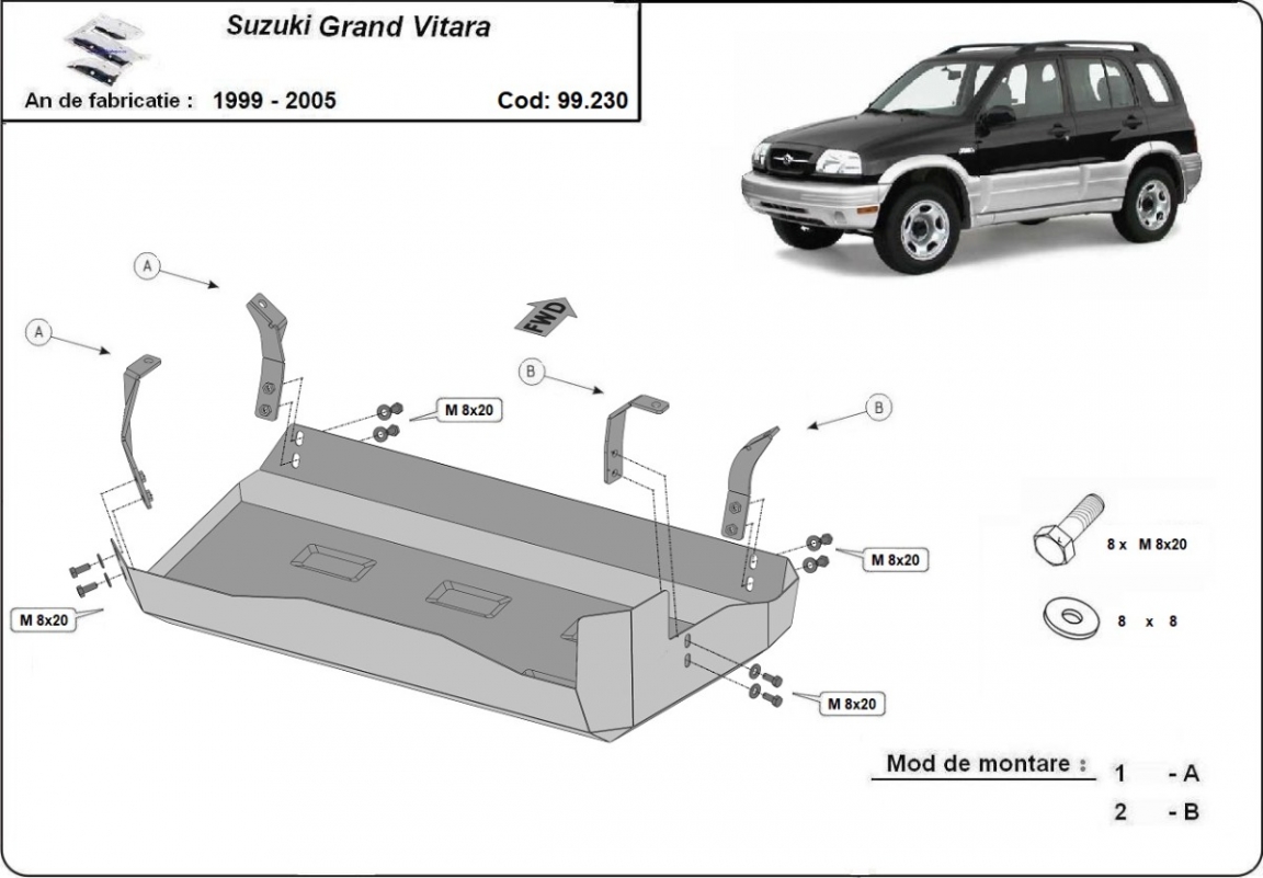 La piastra paramotore di Acciaio è nuova e si adatta perfettamente a tutte le versioni di Suzuki Grand Vitara prodotte tra il 1999 e il 2005. É fatto di lamiera d'Acciaio di 2mm. Bulloni, dadi, rondelle e tutti gli accessori allegati Ogni piastra è resistente alla corrosione ed è ricoperto di vernice in polvere. Le piastre di protezione del motore sono attrezzati di coppie saldate per la miglior resistenza alle forze exteriori. |