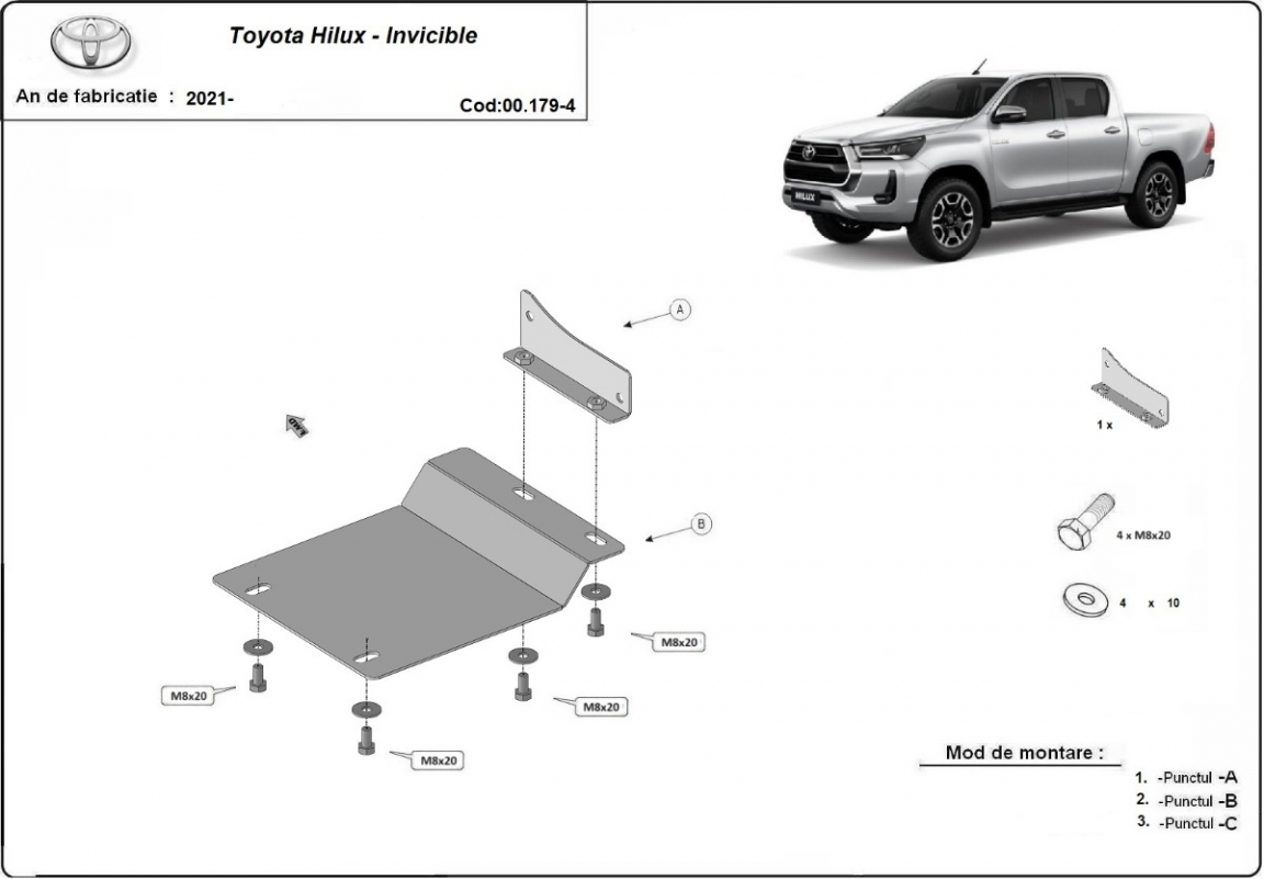 La piastra paramotore di Acciaio è nuova e si adatta perfettamente a tutte le versioni di Toyota Hilux prodotte tra il 2021 e il 2026. É fatto di lamiera d'Acciaio di 2mm. Bulloni, dadi, rondelle e tutti gli accessori allegati Ogni piastra è resistente alla corrosione ed è ricoperto di vernice in polvere. Le piastre di protezione del motore sono attrezzati di coppie saldate per la miglior resistenza alle forze exteriori. |